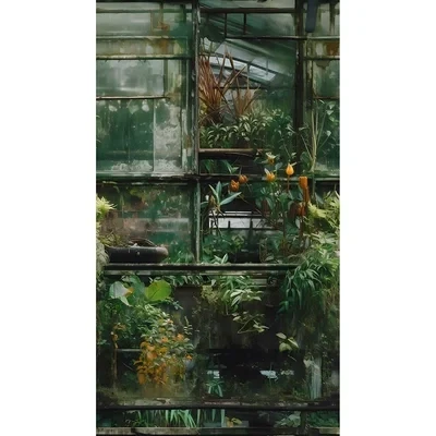 A digital mural, with an image through a glass house or conservatory, filled with hot house plants. The design is supplied on a roll 53cm wide and can be repeated from left to right if you purchase additional murals.