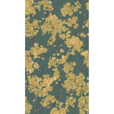 A digital mural image of elegant cherry blossom in yellow gold on a rich teal fabric look background. The design is supplied on a roll 53cm wide and can be repeated from left to right if you purchase additional murals.