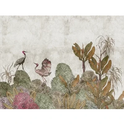 WallpaperDirectUnder a limestone sky the storks pick among the banana and ponytail palms where the hedgebushes also grow, identified by their dense 'tiffany shade' foliage.A 7x panel mural, WxH dimensions 371x280cm, free pattern match