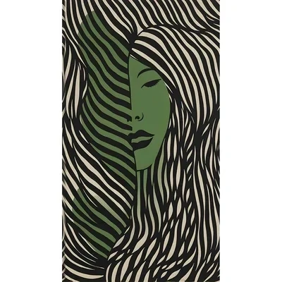 A digital mural, with a large scale image of a green face wrapped in folds of black and white stripes. The design is supplied on a roll 53cm wide and can be repeated from left to right if you purchase additional murals.