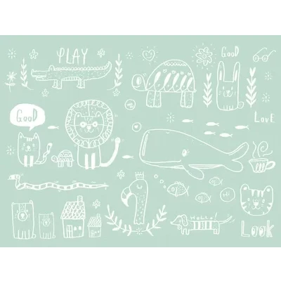 WallpaperDirectChalkboard-style madcap scene of fun-loving animals: dogs and cats, whales chased by cups of tea, fish blow bubbles; they haven't any troubles, play good and play nicely. A 7x panel mural, WxH dimensions 371x280cm, free pattern match.