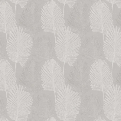 WallpaperDirectA lightly textured vinyl design with an all over fabric effect, overlaid with single palm leaves drawn in fine lines in alternate colours. Shown in the Silver Grey colourway.