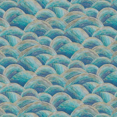 A contemporary textured design featuring painterly overlapping arches, giving the impression of a softly undulating sea. Subtle strokes of metallic ink bring dimension to the gentle curved pattern. Shown here in the Blue colourway. 39105-1