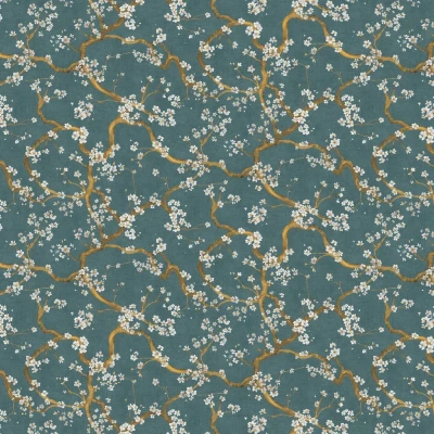 A lightly textured vinyl design with branches laden with cherry blossom. Shown here in the Teal colourway with gold highlights.
