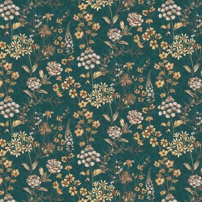 A delicate spray of wild flowers are displayed against a subtle geometric pattern. Shown here in the Teal colourway. 39117-4