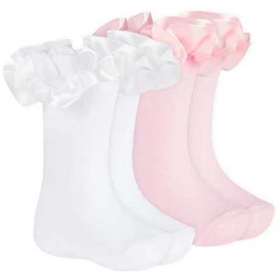 Metzuyan 2 Pack Baby Girls Newborn Tutu Satin Frill Socks Cotton Rich White Pink 0
