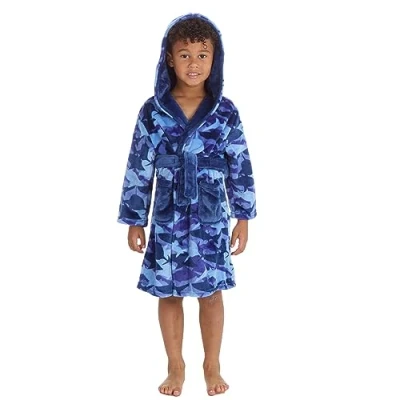 BOYS ROBE - This Boys novelty dressing gown is available in range of colours and designs in age 2, 3, 4, 5, 6, 7, 8, 9, 10, 11, 12, 13 Years. AMAZING DESIGN - These comes in awesome designs, such as shark, camo, space dragon, dino, pixel game and football. COMFY NIGHTWEAR - Featuring a snuggly hood, long sleeves, secure tie belt, two front patch pockets and knee length. SUPER COSY - Made from 100% Polyester Plush Fleece, what makes them ultra soft to the touch, warm, comfy, lightweight, highly durable and easy to care for. IDEAL GIFT IDEA - These are great for a gift! You can give it to your son, brother or nephew for Xmas Eve Day, Christmas, Birthday or without any occasion.