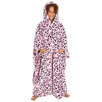 Metzuyan WS AW23 Kids Girls Heart Print Oversize Hooded Poncho Blanket Plush Fleece Warm Cosy Pink Leopard One Size