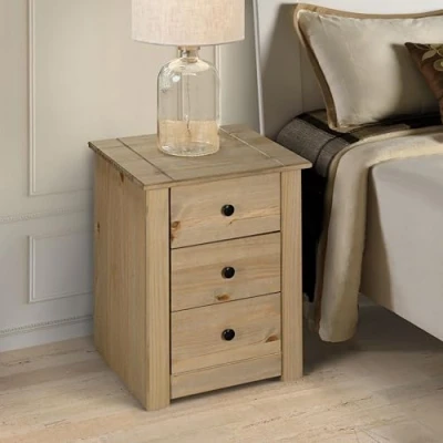 Tops Featuring Subtle Inset Groove Details Solid Pine With a Beautiful Waxed-Oak finish Neutral Brown Colour Generous Storage With 3 Drawers Flat Pack for Easy Home Assembly Black Metal Hardware Dimensions: W 46.5 x D 40.5 x H 57 cm