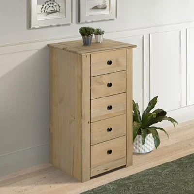Tops Featuring Subtle Inset Groove Details Solid Pine With a Beautiful Waxed-Oak finish Neutral Brown Colour Generous Storage With 5 Drawers Flat Pack for Easy Home Assembly Black Metal Hardware Dimensions: W 46 x D 40 x H 89 cm