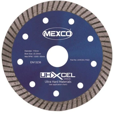 MEXCO UHXCEL Ultra Hard Plus Diamond Blades have been specifically designed and manufactured for cutting ultra hard materials such as; Granite, Porcelain, Marble, Ceramic Tiles, Clay Roof Tiles and other hard natural stone and man-made fired materials. With an ultra thin castellated turbo segment, the MEXCO UHXCEL Diamond Blade delivers a fantastic cutting performance. Perfect for: Tile Fitters, Roofers, Kitchen Fitters, Stone Workers, Plumbers, Civil Engineers and General Building Contractors. Advisory: Maximum Recommended Cutting Depth: 20mm. 1 x MEXCO UHXCEL Ultra Hard Materials Diamond Blade 115 x 22mm