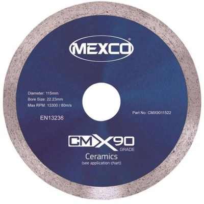 The MEXCO X90 Grade Ceramic Materials Diamond Blade has been developed with a continuous rim segment to cut ceramic tiles quickly and cleanly. The performance of this product can be attributed to its high diamond concentration allowing a large amount of diamond grit to be exposed at all times producing a fast accurate clean cut. When taking on a job such as tiling, whether on the walls or floors, its the finish which really matters. A general purpose blade will chip, not cut neatly or accurately and will not last very long. Mexcos diamond blade for ceramic cutting has been designed to give an excellent cut, have a low wear rate, but still be great value for money. 1 x MEXCO X90 Grade Ceramic Materials Diamond Blade 115 x 22mm