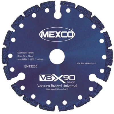 General description The Mexco VBX90 Grade Universal Diamond Blade is designed for high-performance cutting, featuring a unique vacuum brazing process that securely attaches large pieces of diamond grit to a steel center. This innovative manufacturing technique ensures that the diamond grit remains in constant contact with the material, resulting in rapid and efficient stock removal. It is suitable for both dry and wet cutting applications. Technical specifications Diameter: 75 mm Thickness: 10 mm