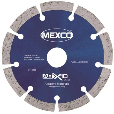 The MEXCO Abrasive Materials X10 Grade Diamond Blade offers the user extended product lifetime when cutting abrasive building materials like medium density concrete blocks and lignacite products due to its harder segment bond. Great value diamond blade offering superb cutting performance; specifically designed and manufactured for the purpose of cutting abrasive materials. The harder segment bond offers the user an extended cutting life over the General Purpose Diamond Blade. Suitable for wet and dry cutting. 1 x MEXCO Abrasive Materials X10 Grade Diamond Blade 125 x 22.23mm