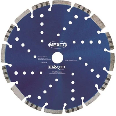 General description The MEXCO XCEL Grade Dual Purpose Diamond Blade measures 230 x 22mm and features a dual bond segment design. It is engineered for fast cutting and long life across a variety of applications, including facing bricks and asphalt. Manufactured with advanced techniques and materials, this blade includes undercutting protection, a dual bond diamond segment configuration, and laser welded segment attachment, making it a top choice for builders and construction workers who frequently cut materials.