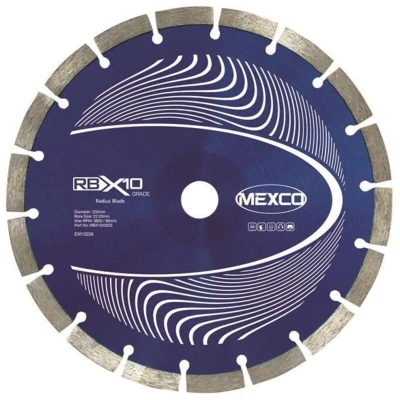 General description The MEXCO RB X10 Radius / Curve Cutting Diamond Blade is specifically designed for precision cutting of curves and radii. With a diameter of 230mm and a bore size of 22.23mm, this blade is compatible with 4.5in and 9in angle grinders, making it versatile for various cutting tasks. Technical specifications Diameter: 230 mm Bore size: 22.23 mm Usage Ideal for cutting curves and radii in concrete, natural stone, and paving slabs. Suitable for landscape gardeners, driveway installers, general builders, and decorative patio work.