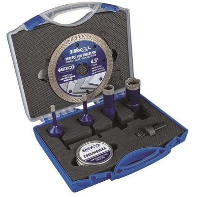 General description The MEXCO Diamond Blade and Tile Drill Kit is ideal for working with ceramics and porcelain. It delivers maximum performance and cost efficiency when drilling and cutting through the hardest engineered and natural decorative materials. Notably, no water is required when using any diamond tool included in this kit. The kit is supplied in a robust carry case for easy transport and storage. Technical specifications Contains: 4 x Tile Drill Bits (6mm, 7mm, 18mm, 25mm) 1 x M14 to Hex Adaptor 1 x Cooling Wax 1 x Ultra Hard Materials Diamond Blade (115mm)