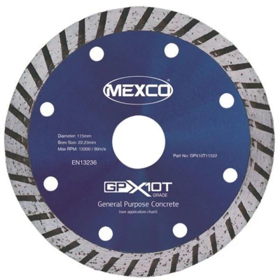 General description MEXCO GP Concrete Turbo Diamond Blade 115 x 22mm is designed to deliver excellent cutting performance for a variety of non-abrasive construction materials commonly used in the UK. With a high concentration of diamonds and premium quality ingredients, this blade is ideal for cutting reinforced concrete, hard limestone, and concrete paviours. Technical specifications Diameter: 115 mm Arbor size: 22 mm