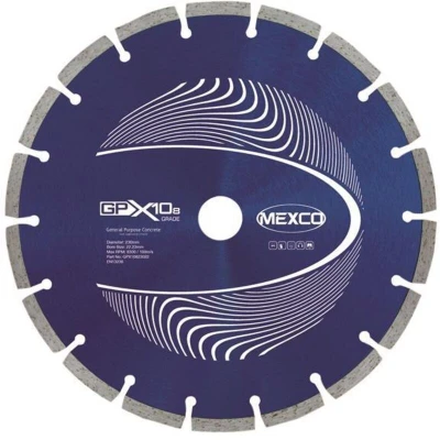 General description MEXCO GPX10-8 Concrete Diamond Blades are specifically designed for cutting a wide range of general-purpose building materials. This blade offers a cost-effective solution for users who need to cut the most commonly used non-abrasive building materials. Technical specifications Diameter: 230 mm Arbor size: 22 mm Segment height: 8 mm Usage The GPX10-8 blade is suitable for cutting various non-abrasive building materials, including: Reinforced Concrete Hard Limestone Concrete Paviours