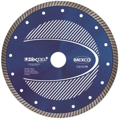 General description MEXCO UHXCEL+ Ultra Hard Plus Diamond Blade 230 x 25.4mm is engineered for fast, clean cutting with minimal chipping. This blade is ideal for ultra hard materials including granite, porcelain, marble, ceramic tiles, clay roof tiles, and other hard natural stone and man-made fired materials. Its ultra thin castellated turbo segment ensures exceptional cutting performance, making it a perfect choice for professionals such as tile fitters, roofers, kitchen fitters, stone workers, plumbers, civil engineers, and general building contractors. Technical specifications Diameter: 230 mm Arbor size: 25.4 mm Maximum recommended cutting depth: 20 mm