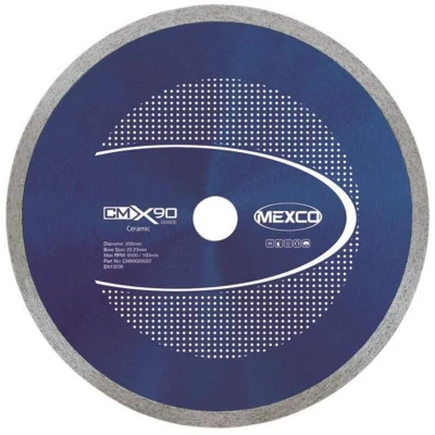 General description The MEXCO X90 Grade Ceramic Materials Diamond Blade is specifically designed for cutting ceramic tiles quickly and cleanly. Its continuous rim segment ensures a smooth and precise cut, making it ideal for both wall and floor tiling projects. Technical specifications Diameter: 200 mm Arbor size: 22.23 mm Grade: X90 Usage This diamond blade is perfect for tiling jobs, providing an excellent cut with a low wear rate. It is engineered to deliver fast, accurate, and clean cuts, making it a reliable choice for both professionals and DIY enthusiasts.