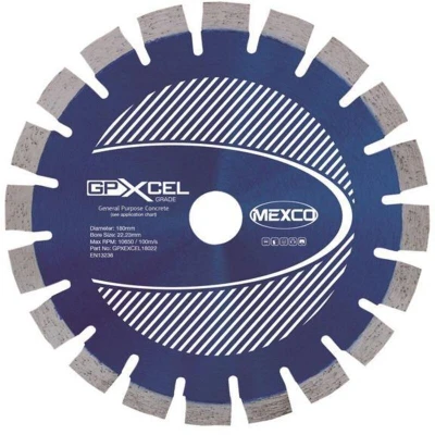 General description MEXCO XCEL GRADE Concrete Diamond Blade is specifically designed for cutting a wide range of general-purpose building materials. This blade is ideal for users who need to cut various non-abrasive materials, including reinforced concrete, hard limestone, and concrete paviours. Technical specifications Diameter: 180 mm Arbor size: 22 mm High diamond concentration for enhanced cutting performance