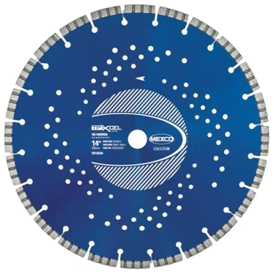 ManoManoGeneral description This MEXCO XCEL Grade Tri-Purpose Diamond Blade is engineered for superior cutting performance on a variety of building and construction materials. It is designed to eliminate the need for changing diamond blades when switching between different materials, making it a versatile choice for professionals and DIY enthusiasts alike. Technical specifications Blade diameter: 350 mm Arbor size: 20 mm Manufacturing technique: Laser welded segments Features: TCT undercutting protection, ventilation holes for cooling Usage This blade is suitable for cutting a wide range of materials, including: Reinforced Concrete Concrete Block Asphalt Ductile Iron Granite Engineering Brick Limestone Breeze Blocks
