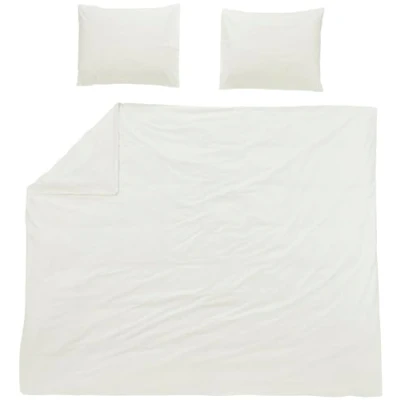 HIGH QUALITY MATERIAL COMPOSITION The Meyco Home bedding set is made with 100% cotton, a material known for its excellent moisture-regulating and temperature-balancing properties. FITS ANY BEDROOM - The duvet cover is available in many different warm colors that will blend perfectly with any bedroom. Optimal warming: thanks to the double continuous wrap strip on the duvet cover, the duvet can be tucked in at the foot end, which prevents slipping during the night and allows easy insertion without losing its length. Care instructions: In order to maintain the quality of the duvet cover as long as possible, we recommend machine washing at up to 40 degrees with a small amount of detergent. In addition, the bed linen is suitable for tumble drying and can also be ironed hot. Box contents: Meyco Home basic jersey plain bed linen for double bed – made from 100% cotton – perfect fit – breathable material – practical wrapping strip – dimensions: 200 x 200 / 220 cm – colour: cream white.