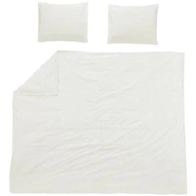 HIGH QUALITY MATERIAL COMPOSITION The Meyco Home bedding set is made with 100% cotton, a material known for its excellent moisture-regulating and temperature-balancing properties. FITS ANY BEDROOM - The duvet cover is available in many different warm colors that will blend perfectly with any bedroom. Optimal warming: thanks to the double continuous wrap strip on the duvet cover, the duvet can be tucked in at the foot end, which prevents slipping during the night and allows easy insertion without losing its length. Care instructions: In order to maintain the quality of the duvet cover as long as possible, we recommend machine washing at up to 40 degrees with a small amount of detergent. In addition, the bed linen is suitable for tumble drying and can also be ironed hot. Box contents: Meyco Home basic jersey plain bed linen for double bed – made from 100% cotton – perfect fit – breathable material – practical wrapping strip – dimensions: 240 x 200 / 220 cm – colour: cream white.