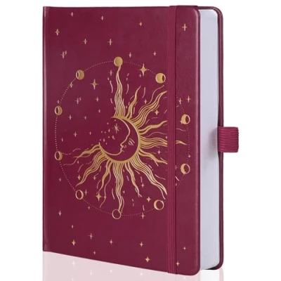 SUN AND MOON GODS COVER: MGGAO Unique cover design allows your notepad to shine with elegance. Our notebooks incorporate the sun and moon motifs. Designed by a creative artist, this elegant cover features impressive foil stamping on both the cover and spine. Available in a wide range of vintage, vibrant colors, it makes the perfect gift for any woman. 160 GSM 190 NUMBERED PAGES: This dotted journal has 190 pages that are 160 GSM thick, and the pages are carefully selected to ensure that you can write in this journal without worrying about ink bleed, ghosting and shadows. The standard 5mm dotted paper not only ensures that your notes are well organized, it creates a collection of ideas and thoughts for you to capture. Lay-flat 180° Design: Classic sturdy covers with 160 GSM thick paper can be lay flat to 180°. After relaxing the binding a bit, it did lay perfectly flat, It’s a comfortable writing experience. DETAILS: With 190 numbered pages, this notebook makes browsing and organizing your notes effortless. It includes an elastic band, two bookmarks for quick page referencing, and a back pocket for cards, notes, and other small items. It’s perfect for meeting notes, travel journaling, brainstorming, and more! SIZE & DIMENSIONS: The MGGAO A5 aesthetic dot journal features 5mm dot grid pages and is medium-sized with approximate dimensions of 5.4 x 8.4 inches (14.7 x 21.4 cm). It's perfect for carrying with you or using at home.