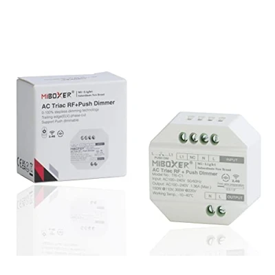 TRI-C1 module: this is a controller that regulates the power of brightness via push button and Mi Light MiBoxer remote controls/Compatible with LED, incandescent or filament bulbs and spotlights/Remote control via Mi Light remote controls/Push button management/Input and output AC 100-240V 50/60Hz/Power: max 300W (150W to 110) V / 3000 W at 220V) / Dimensions 49 x 49 x 25 mm Functions: this module allows you to increase and decrease the light output of 1 or more AC 100 – 240 V devices dimmable via Triac protocol, phase cutting, trailing edge. / Variation can be done by push button or via Mi Light MiBoxer remotes. Only works with dimmable LED devices. ! Built-in RF: Mi Light MiBoxer TRI-C1 module can receive signal from multiple control sources at the same time, such as 1 x Mi Light MiBoxer remote control and 1 x Mi Light MiBoxer wall controller. It is possible to use up to a maximum of 8/10 remote controls and wall controller Mi Light. Physical Button: We thought that sometimes a wall mounted physical control can still be the best solution, especially when you have children and elderly people at home. For this, the possibility of managing the lights by button has been added. One quick key to turn on and off, an extended key for dimmer. You can use several buttons in parallel. VOICE REMOTE & SMARTPHONE - If you want to manage this TRI-C1 module from your smartphone and voice devices, you can purchase a WL-iBox1 gateway from Mi Light MiBoxer separately, download the free app "MiBoxer Smart" or "Smart Life", access WiFi and start having fun with the many functions and manage the lights comfortably sitting on the sofa. Thanks to the app, you will be able to control the lights even when you are out of the house. Warranty: 3 years on all devices sold by King LED as an official Mi Light MiBoxer dealer and brand owner / MiBoxer is a sub-brand of Mi Light Power (W): 300 W