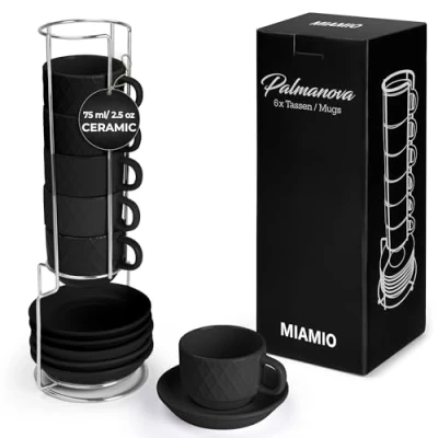 MIAMIO 6 x 75 ml Stoneware Espresso Mug, Cup Set Modern with Stand and Saucers Palmanova Collection (Black)