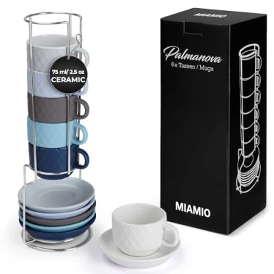 𝐄𝐘𝐄 𝐂𝐀𝐓𝐂𝐇𝐈𝐍𝐆 𝐃𝐄𝐒𝐈𝐆𝐍 – The MIAMIO espresso set makes every morning a special one. The modern, matte-finished exterior diamond pattern gives the ceramic cups a sophisticated and high-quality look. 𝐇𝐈𝐆𝐇 Q𝐔𝐀𝐋𝐈𝐓𝐘 – The high quality, stoneware finishing makes the colors stand out. The diamond pattern gives the cups a unique surface. The high resistance of our ceramic cups to wear and tear guarantees you a lifetime of the highest quality. 𝗪𝐇𝐀𝐓’𝐒 𝐈𝐍 𝐓𝐇𝐄 𝐁𝐎𝐗 – The set consists of 6 cups, which each have 75 ml volume. Our cups of the series "Palmanova" are available as a combo in 6 different colors. It also includes a metal holder and 6 saucers. The espresso cups are ideal for everyday use, but also for giving as a gift for Christmas, Birthday or other occasions. 𝐄𝐀𝐒𝐘 𝐂𝐀𝐑𝐄 – Our espresso cup set is microwave safe, dishwasher safe and refrigerator safe, so you can use the products in all daily situations. Furthermore, the cups are packaged in drop-tested packaging. A safe delivery is thus guaranteed. 𝐌𝐈𝐀𝐌𝐈𝐎 – We are a German company with a very high-quality expectation for our products. Your satisfaction is an important priority of ours which is why an accordingly professional und fast customer service goes without saying., Weight: 2.20462262 pounds, Manufacturer: MIAMIO