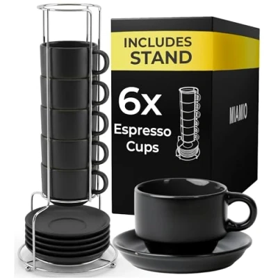 MIAMIO 75 ml Espresso Cup Set with Saucers Coffee Mug of 6 Ceramic Stackable Stand for Drinks, Latte, Cafe Mocha Le Papillon Collection (Black)