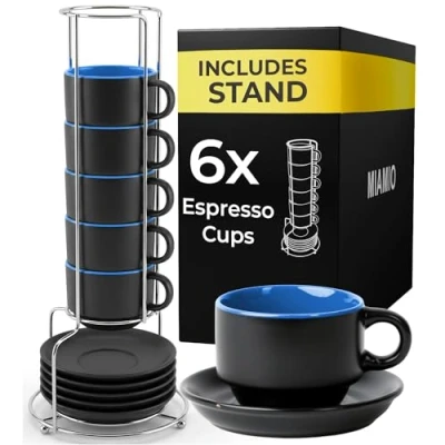 MIAMIO 75 ml Espresso Cup Set with Saucers Coffee Mug of 6 Ceramic Stackable Stand for Drinks, Latte, Cafe Mocha Le Papillon Collection (Blue)