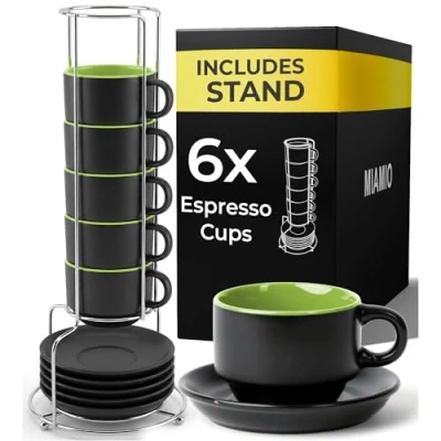 MIAMIO 75 ml Espresso Cup Set with Saucers Coffee Mug of 6 Ceramic Stackable Stand for Drinks, Latte, Cafe Mocha Le Papillon Collection (Green)