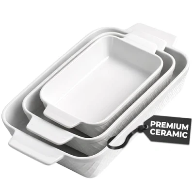 𝐂𝐄𝐑𝐀𝐌𝐈𝐂 𝐁𝐀𝐊𝐈𝐍𝐆 𝐃𝐈𝐒𝐇 𝐒𝐄𝐓 - The large MIAMIO ceramic baking dish set includes three rectangular baking pans of different sizes. The mini baking dish with 850 ml for single servings. The small baking dish with 1650 ml for two servings, and the large baking dish with 2900 ml for four or more servings. 𝐒𝐓𝐀𝐂𝐊𝐀𝐁𝐋𝐄 𝐂𝐄𝐑𝐀𝐌𝐈𝐂 𝐏𝐀𝐍𝐒 - Our ceramic baking dishes are designed for easy and space-saving storage in the kitchen. Each rectangular ceramic pan features the modern and trendy white Palmanova design, distinguished by its elegant diamond pattern. They perfectly match other Palmanova items such as the plate set. 𝐕𝐄𝐑𝐒𝐀𝐓𝐈𝐋𝐄 𝐔𝐒𝐄 - The high-quality construction of our oven-safe stoneware baking dishes makes them extremely versatile. The casserole dishes for oven can be used for preparing meat, different casseroles and lasagna dishes. They are also suitable for non-oven uses such as preparing and serving tiramisu. 𝐃𝐔𝐑𝐀𝐁𝐋𝐄 𝐀𝐍𝐃 𝐄𝐀𝐒𝐘 𝐓𝐎 𝐂𝐋𝐄𝐀𝐍 - Each baking dish is coated to be food-safe, ensuring they are safe for daily use. Additionally, the cooking pan set is dishwasher-safe, microwave-safe, freezer-safe, and oven-safe. This ensures easy cleaning and worry-free handling in the kitchen. 𝐆𝐈𝐅𝐓 𝐅𝐎𝐑 𝐇𝐄𝐑/𝐇𝐈𝐌 - Securely packaged in a high-quality gift box, this baking pan set makes the perfect gift for friends or family. The kitchen cookware set is ideal for housewarming parties, Easter, Christmas, Thanksgiving, Valentine's Day, and many other occasions., Weight: 10.0530791472 pounds, Manufacturer: MIAMIO