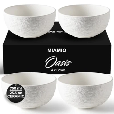 𝐖𝐇𝐈𝐓𝐄 𝐂𝐄𝐑𝐀𝐌𝐈𝐂 𝐁𝐎𝐖𝐋 - These large ceramic cereal bowls can hold up to 750 ml of your morning cereal. Each set comes with four (4) white soup bowls. Their large capacity makes our serving bowl perfect for enjoying all types of dishes. The stackable ceramic bowl design makes them easy to store in your kitchen. 𝐄𝐘𝐄𝐂𝐀𝐓𝐂𝐇𝐈𝐍𝐆 𝐃𝐄𝐒𝐈𝐆𝐍 - Each of the serving bowls features our signature Oasis design. The embossed slate texture blends vintage and modern aesthetics, making it suitable for every occasion: from your morning meal to wedding ceremonies and everything in between. These dinner bowls are sure to get compliments everywhere you take them. 𝐏𝐑𝐄𝐌𝐈𝐔𝐌 𝐂𝐄𝐑𝐀𝐌𝐈𝐂 𝐌𝐀𝐓𝐄𝐑𝐈𝐀𝐋 - These large ramen bowls are made from high-quality stoneware ceramics. Our glaze is made of lead-free, cadmium-free, non-toxic materials and is fired at 1300°C. This makes our fruit bowl especially durable. Our thick build quality also ensures that warm foods like pasta and soup stay hot longer. 𝐌𝐈𝐂𝐑𝐎𝐖𝐀𝐕𝐄 𝐀𝐍𝐃 𝐃𝐈𝐒𝐇𝐖𝐀𝐒𝐇𝐄𝐑 𝐒𝐀𝐅𝐄 - Each ceramic spaghetti bowl is safe to use in the fridge, dishwasher, and microwave, thanks to the high build quality of our stoneware bowls. Preparing food in our microwavable bowls is an absolute breeze, and cleaning them in the dishwasher is a big time-saver. 𝐏𝐄𝐑𝐅𝐄𝐂𝐓 𝐆𝐈𝐅𝐓 𝐅𝐎𝐑 𝐇𝐄𝐑/𝐇𝐈𝐌 - Looking for a thoughtful gift for that special someone? Packaged in a beautiful gift box, these large serving bowls are the perfect present for Valentine's Day, Mother's Day, birthdays, housewarmings, Christmas, and many other special occasions. Surprise him or her with this exclusive dinnerware set!, Manufacturer: MIAMIO