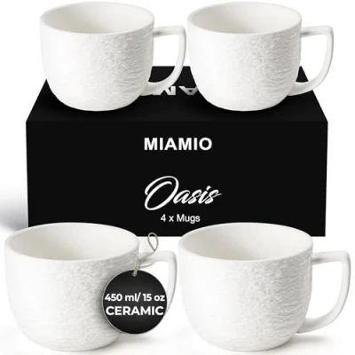 𝐋𝐀𝐑𝐆𝐄 𝐂𝐎𝐅𝐅𝐄𝐄 𝐌𝐔𝐆𝐒 - These large ceramic coffee cups can hold up to 450 ml of your favorite tea or coffee. Each set comes with four (4) white coffee mugs. Their big handle makes each cappuccino cup, easy and comfortable to hold for long periods. The stackable coffee mugs design makes them easy to store in your kitchen. 𝐄𝐘𝐄𝐂𝐀𝐓𝐂𝐇𝐈𝐍𝐆 𝐃𝐄𝐒𝐈𝐆𝐍 - Each of the white coffee cups features our signature Oasis design. The embossed slate texture blends vintage and modern aesthetics, making it suitable for every occasion: from your morning coffee to wedding ceremonies and everything in between. These ceramic mugs are sure to get compliments everywhere you take them. 𝐏𝐑𝐄𝐌𝐈𝐔𝐌 𝐂𝐄𝐑𝐀𝐌𝐈𝐂 𝐌𝐀𝐓𝐄𝐑𝐈𝐀𝐋 - These large coffee mugs are made from high-quality stoneware ceramics. Our glaze is made of lead-free, cadmium-free, non toxic materials and fired at 1300°C. This makes our cups especially durable. Our thick build quality also ensures that drinks like coffee, tea or hot chocolate stay hot for longer. 𝐌𝐈𝐂𝐑𝐎𝐖𝐀𝐕𝐄 𝐀𝐍𝐃 𝐃𝐈𝐒𝐇𝐖𝐀𝐒𝐇𝐄𝐑 𝐒𝐀𝐅𝐄 - Each ceramic coffee mug is safe to use in the fridge, dishwasher, and microwave, thanks to the high build quality of our stoneware mugs. Preparing drinks in our Oasis stoneware coffee mugs is an absolute breeze, and cleaning them in the dishwasher is a big time-saver. 𝐏𝐄𝐑𝐅𝐄𝐂𝐓 𝐆𝐈𝐅𝐓 𝐅𝐎𝐑 𝐇𝐄𝐑/𝐇𝐈𝐌 - Looking for a thoughtful gift for that special someone? Packaged in a beautiful gift box, these coffe mugs are the perfect present for Valentine's Day, Mother's Day, birthdays, housewarmings, Christmas, and many other special occasions., Manufacturer: MIAMIO