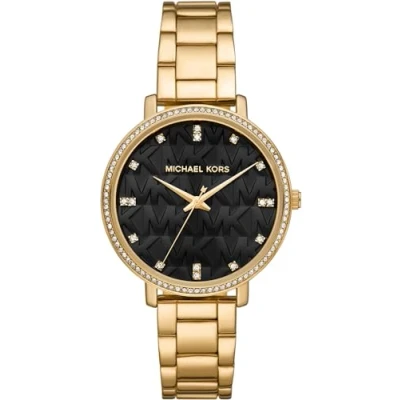 39mm case, 16mm band width, mineral crystal, Quartz movement with 3-hand analog display, imported. Round alloy case, with a black dial. Gold, alloy bracelet. Water resistant up to 30m: Will withstand splashes in water.