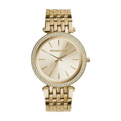 The Michael Kors MK3191 Gold Plated Darci Quartz Watch features a stylish gold-tone stainless steel case and bracelet, precise three-hand quartz movement, and a sleek, minimalist dial, offering a perfect blend of modern elegance and timeless sophistication for any occasion. Water resistant up to 50 meters.