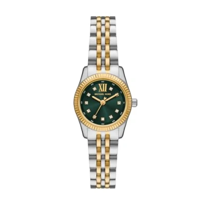 Dial: Sunray green dial. Case & Movement: 26mm gold-tone stainless steel case, scratch-resistant mineral crystal, quartz movement with 3-hand analog display. Watch Band: Two-tone gold and silver stainless steel bracelet with 20mm width; adjustable links for customized fit. Water Resistance: 5 ATM / 50m (165ft) water resistance. Warranty: 2 Years Manufacturer Warranty