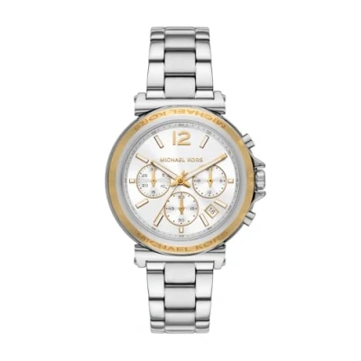 40mm case, 16mm band width, mineral crystal, Quartz movement with chronograph analogue display, imported. Round stainless steel case, with a white dial. Silver, stainless steel bracelet. Water resistant up to 50m: Wearable while swimming in shallow water.