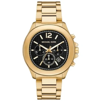 42mm case, 22mm band width, mineral crystal, Quartz movement with chronograph analog display, imported. Barrel stainless steel case, with a black dial. Gold, stainless steel bracelet. Water resistant up to 30m: Will withstand splashes in water.