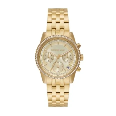35mm case, 18mm band width, mineral crystal, Quartz movement with chronograph analog display, imported. Round stainless steel case, with a gold dial. Gold, stainless steel bracelet. Water resistant up to 50m: Wearable while swimming in shallow water.