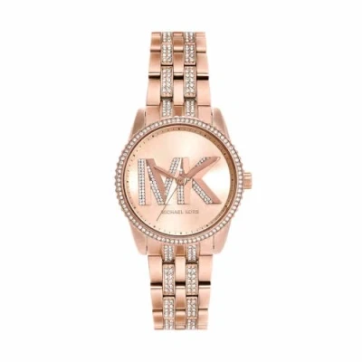 Case and Movement: 35 mm case, 18 mm band width, scratch resistant mineral crystal, accurate quartz movement with 3-hand analogue display, imported. Dial: Round rose gold stainless steel case, with a pave sunray rose gold dial. Watch Band: Rose Gold durable stainless steel bracelet; links can be removed for a customised fit. Water Resistant: Up to 50m (165ft): Wearable for short periods of recreational swimming and showering, but not diving or snorkeling; 5 ATM.