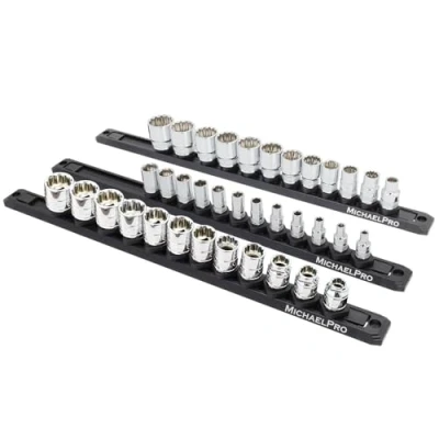 MichaelPro 3 Piece Quick Lock Magnetic Socket Organizer Rail Set 1/4 Inch, 3/8 and 1/2 Inch Drive Tool Organizers, Hold 36 Sockets, Heavy Duty Aluminum Storage MP014040