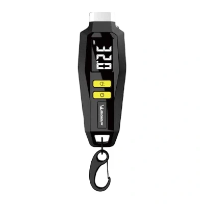 Digital tyre pressure monitor. Quickly check your tyre inflation for safety on the road Measures tire pressure from 0.05 bar to 7 bar with an accuracy of 0.05 bar Easy reading of the result with tyre pressure display on digital LCD display Pressure gauge measuring units: bar, psi, kPa, kg/cm² Tire pressure gauge equipped with a key ring type hook to take it anywhere. Comes with 2 replaceable CR52032 batteries