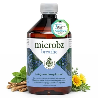 AWARD-WINNING LIQUID PROBIOTIC: Voted Best Healthy Drink at the Nourish Awards, our liquid probiotics are bio-live and active, surviving stomach acid more effectively than other probiotic drinks, capsules or tablets, for faster absorption and immediate digestive system support. And it’s 100% Natural! 15 SOIL-BASED STRAINS DIVERSITY BOOST: Unlike basic probiotics, Microbz Breathe contains 15 soil-based live bacteria strains including Lactobacillus, Bifidobacterium and Bacillus, fermented with Elderberry, Thyme, and Mullein to support the gut microbiome and seasonal changes. FERMENTED HERBS FOR RESPIRATORY SUPPORT: Specifically formulated to help manage bloating and digestive discomfort while supporting the body's natural defences for the lungs and upper respiratory tract. This powerful gut health drink works with your body to maintain a balanced internal environment and clear, natural breathing throughout the seasons. VEGAN, UK MADE & SHELF STABLE: Hand-brewed in the UK, Microbz is a family-run business producing award-winning bio live cultures right here in Wiltshire. 100% natural, dairy-free, and gluten-free, with no refrigeration required, making it perfect for travel or the kitchen counter. Vegan and vegetarian approved. TIRED OF PILLS AND POWDERS? DITCH THE PILLS! One 15ml serving of this live culture liquid provides a full daily dose of beneficial bacteria and traditional botanicals in a comprehensive adult probiotic course designed to revitalise your core health from the inside out in 100% recycled plastic.