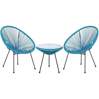 General description This modern 3-piece Bistro Set ACAPULCO II features a stylish design inspired by iconic Mexican aesthetics. It includes 2 chairs and a table, making it suitable for both indoor and outdoor settings. The set is crafted with a PE-rattan string weave and a robust powder-coated steel frame, ensuring durability and a contemporary look. The tempered glass tabletop is secured with suction cups, providing ample space for beverages and snacks. Technical specifications Product Type: Bistro Set Style: Boho General Color: Blue, Black Main Material: PE Rattan Additional Material: Steel Top Material: Glass Finish: Powder Coated Seats Up To: 2 People Chair Dimensions: 70x90x87 cm Coffee Table Dimensions: 50x50x49 cm Seat Height: 41 cm Overall Dimensions: 70x90x87 cm Weight: 17 kg Chair Weight Capacity: 160 kg Table Weight Capacity: 50 kg Installation Partial assembly required (20-40 min). Usage Recommended to check assembly stability 2 weeks after setup. Check screws for